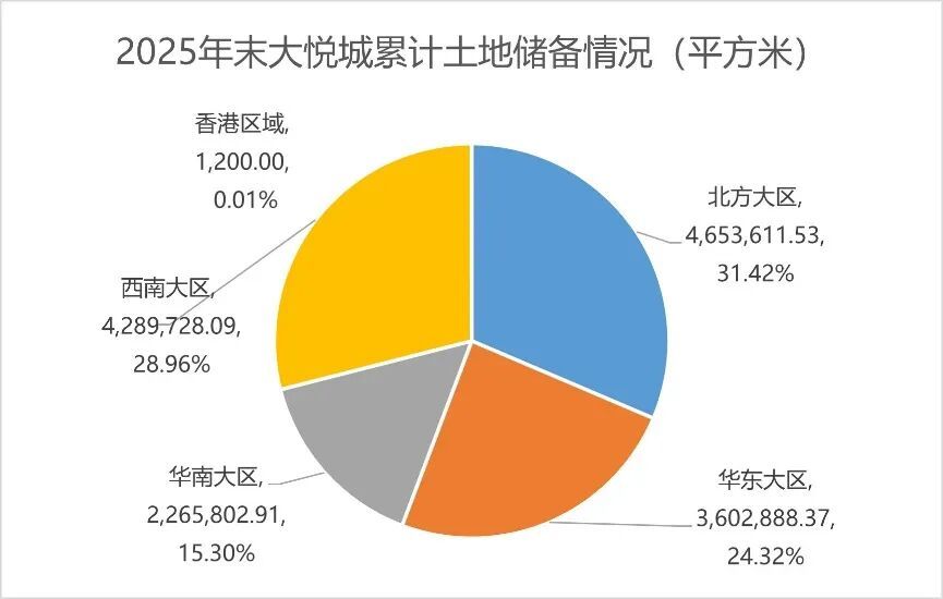 截至期末,大悦城土地储备主要分布于京津冀、长三角、粤港澳大湾区、成渝、长江中游等核心都市圈,土地储备可售货值约969亿元(不含一级开发旧改等土储项目);累计土地储备1481.32万平方米,按区域划分,北方大区、华东大区、华南大区、西南大区、香港大区分别占比31.42%、24.32%、15.3%、28.96%、0.01%。